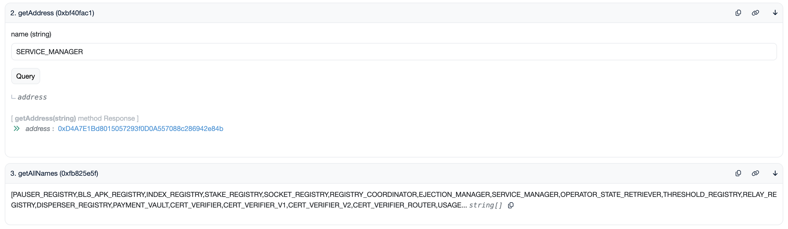 - Click on "getAllNames()" function to see the name of all registered contracts.